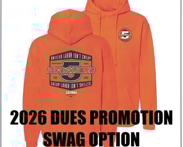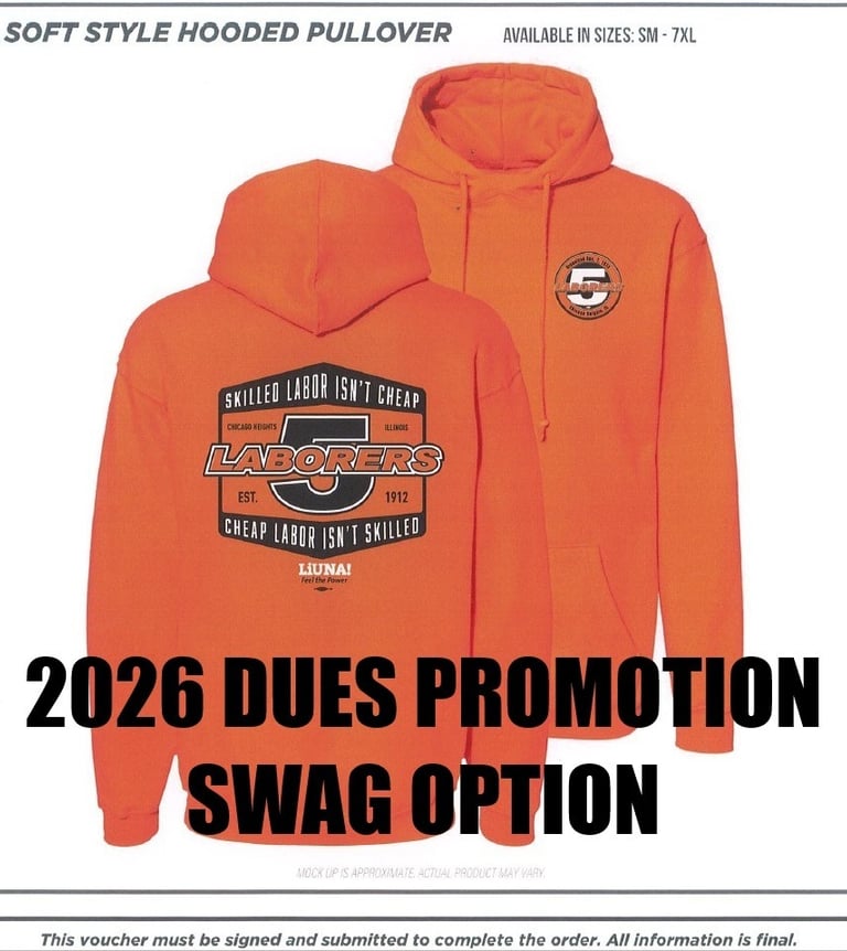 Members who paid all 4 quarters, $480, by Friday February 28, 2026 received a $50 voucher for Blue Collar Supply or a Local 5 swag item. Please call the Local 5 office or stop by if you have any questions about the promotion, voucher redemption or expiration dates. Payment must have be postmarked or made by 2/28/2026.